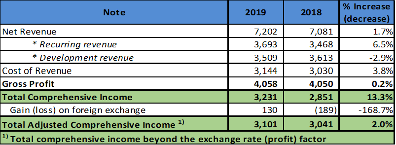 2019 income is composed of 51% recurring revenue and 49% development revenue, consistent with Company’s strategy to grow with balanced composition of recurring and development revenue.