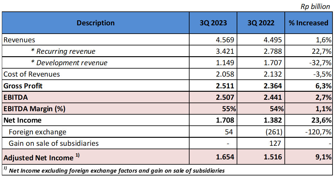 Company’s Development revenue in Q3 2023 amounting to Rp 1.149 billion decrease 32,7% compared to last year of Rp 1.707 billion, the decrease in revenue is off set with the increase in recurring revenue, so in total Company’s revenue still grows.