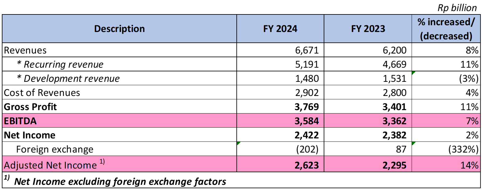 PT Pakuwon Jati (PWON) booked yearly net revenue for 2024 at Rp 6.67 trillion, an increase of 8% compared to last year of Rp 6.20 trillion. Gross Profit is recorded at Rp 3.77 trillion, an increase of 11% compared to last year of Rp 3.40 trillion. EBITDA of Rp 3.58 trillion is 7% better than last year of Rp 3.36 trillion while Adjusted Net Profit increases 14% from Rp 2.29 trillion last year to Rp 2.62 trillion this year.