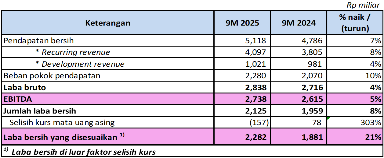PT Pakuwon Jati Tbk (PWON) kembali membukukan kinerja yang solid untuk periode sembilan bulan yang berakhir pada September 2025. Perseroan mencatat pendapatan bersih sebesar Rp 5,12 triliun, meningkat 7% dibandingkan periode yang sama tahun sebelumnya sebesar Rp 4,79 triliun. Laba kotor tercatat sebesar Rp 2,84 triliun, naik 4% dibandingkan Rp 2,72 triliun pada tahun sebelumnya, sementara EBITDA tumbuh 5% menjadi Rp 2,74 triliun dari Rp 2,62 triliun. Secara khusus, Laba Bersih yang Disesuaikan meningkat 21% menjadi Rp 2,28 triliun dibandingkan Rp 1,88 triliun tahun lalu, mencerminkan kekuatan dan ketahanan strategi pengembangan properti terpadu dan portofolio recurring income yang tangguh.