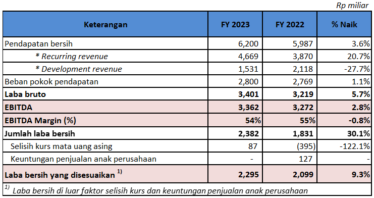 Development revenue Perseroan tahun 2023 mencapai Rp 1.531 miliar turun 27,7% dibanding tahun lalu sebesar Rp 2.118 miliar.