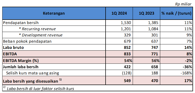 Development revenue Perseroan periode triwulan 1 tahun 2024 mencapai Rp 329 miliar naik sebesar 9% jika dibandingkan dengan periode yang sama tahun lalu sebesar Rp 301 miliar.