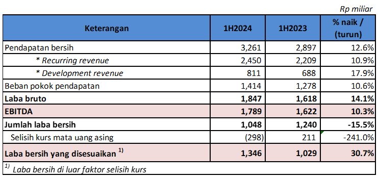 PT Pakuwon Jati (PWON) membukukan pendapatan bersih periode semester 1 tahun 2024 sebesar Rp 3,26 trilliun, naik 13% dari periode yang sama tahun sebelumnya yang sebesar Rp 2,90 trilliun. Laba Bruto tercatat sebesar Rp 1,85 trilliun, naik 14% dibanding periode yang sama tahun lalu sebesar Rp 1,62 trilliun. EBITDA sebesar Rp 1,79 trilliun, naik 10% dibanding periode yang sama tahun sebelumnya sebesar Rp 1,62 trilliun. Laba Bersih yang disesuaikan tercatat sebesar Rp 1,35 trilliun, naik 31% jika dibandingkan dengan periode yang sama tahun lalu sebesar Rp 1,03 trilliun.