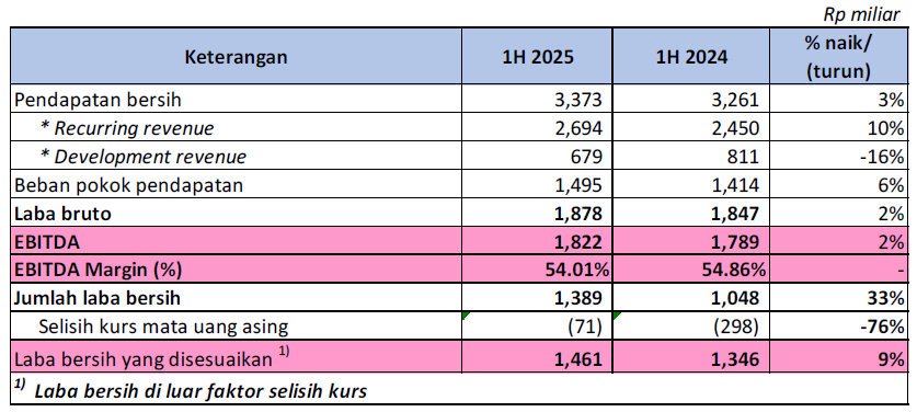 PT Pakuwon Jati (PWON) membukukan pendapatan bersih periode semester 1 tahun 2025 sebesar Rp 3,37 trilliun, naik 3% dari periode yang sama tahun lalu yang sebesar Rp 3,26 trilliun. Laba Bruto tercatat sebesar Rp 1,88 trilliun, naik 2% dibanding periode yang sama tahun lalu sebesar Rp 1,85 trilliun. EBITDA sebesar Rp 1,82 trilliun, naik 2% dibanding periode yang sama tahun lalu sebesar Rp 1,79 trilliun. Laba Bersih tercatat sebesar Rp 1,39 trilliun, naik 33% jika dibandingkan dengan periode yang sama tahun lalu sebesar Rp 1,05 trilliun.